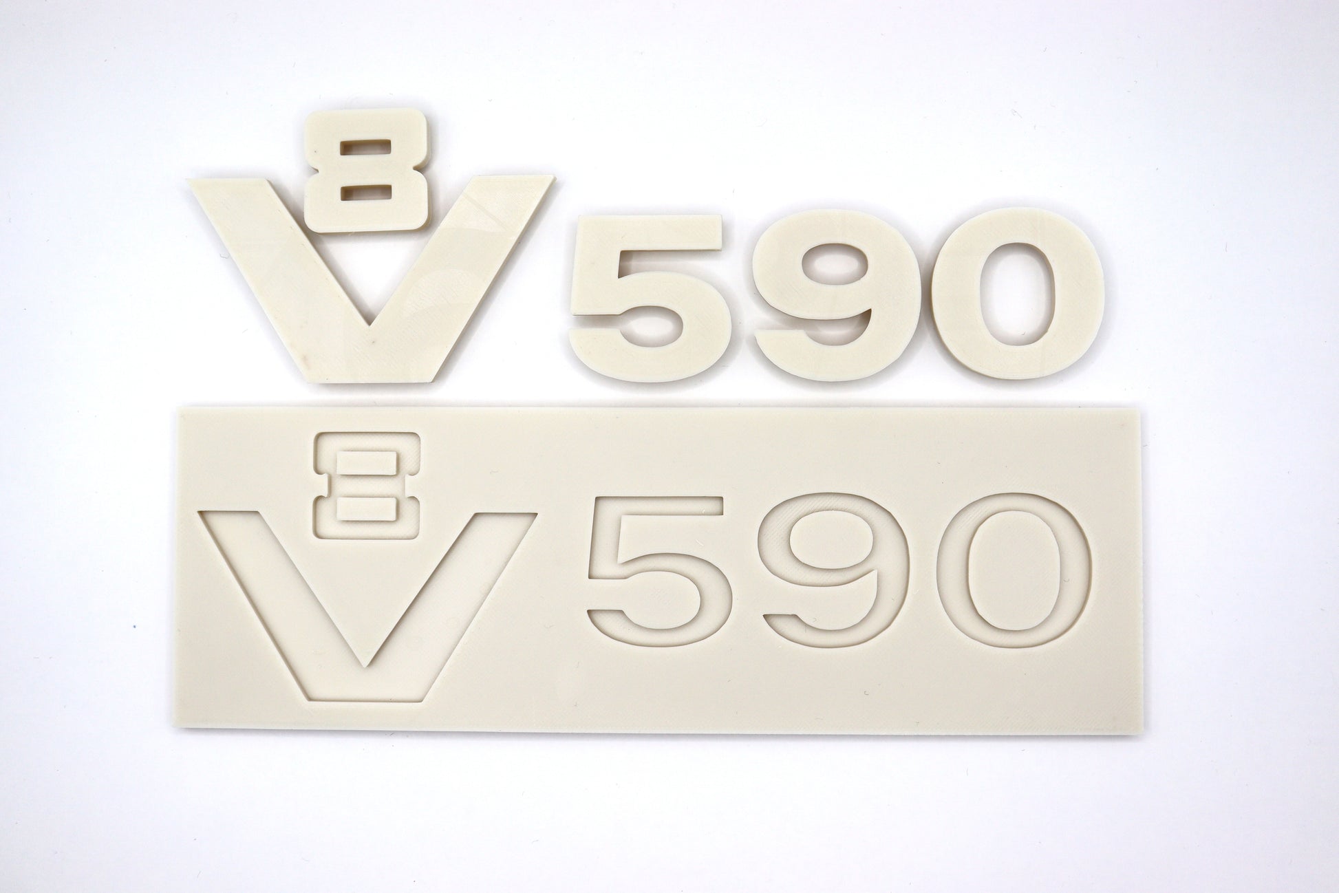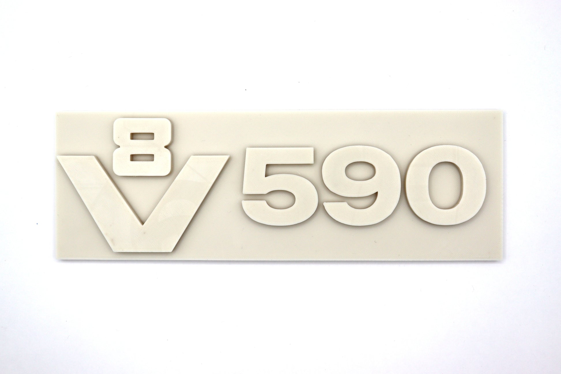 Dit 3D-geprinte V8 590 typeplaatje wordt geleverd in een neutrale kleur, zodat het eenvoudig in elke gewenste kleur kan worden gespoten. Het ontwerp is geïnspireerd op de klassieke Scania 4-serie, voor een oldskool uitstraling.